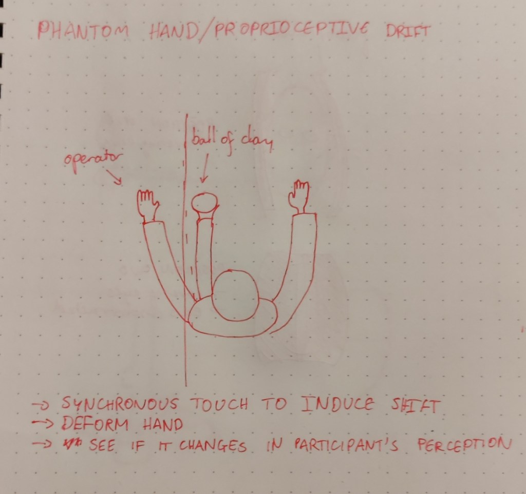Today, we attempted to collate and synthesise our findings from yesterday’s research, while deciding on the topics we would pursue in our first stage of prototyping. I came into the session with a couple of very rough prototype sketches, focusing on the phantom hand illusion and of sensory deprivation; while we didn’t pursue the prototypes themselves, the idea of sight deprivation became an increasingly important theme.