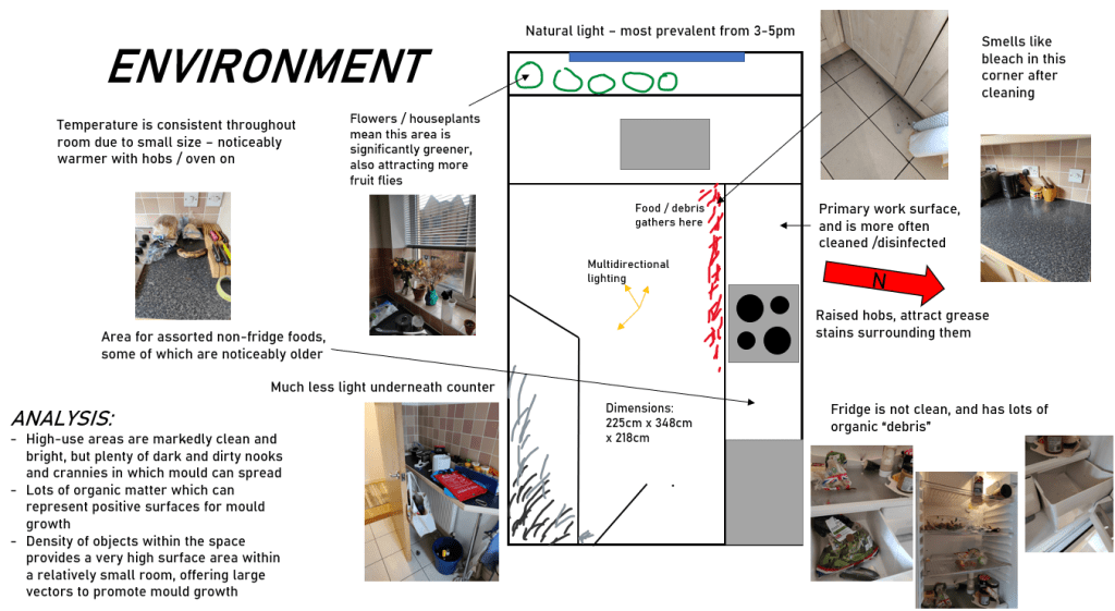 We started our next stage of research by re-attempting our AEIOU observations. We chose the kitchen as the area, and assigned each of ourselves a letter – I was given E for Environment.