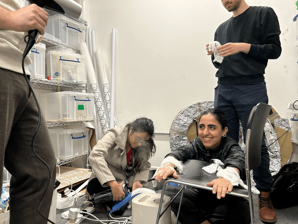 We also did some trials playing with humidity, temperature and airflow by using hairdryers, a humidifier and steam irons. The humidifier especially did not do too much in the couple of minutes we would have for the experience on Thursday, but we decided to keep it in as a visual effect – in retrospect, this “kitchen sink” approach was not helping the cohesion of our final product.