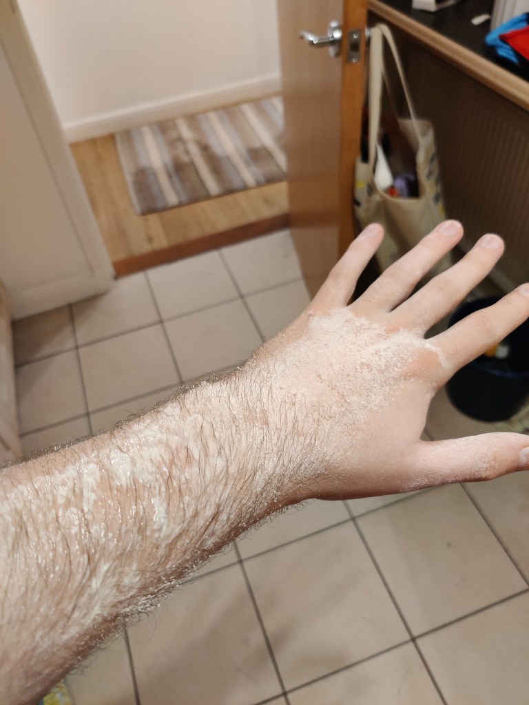 We also experimented with materials that were closer in look and feel to mould than bubbles. I had tested flour as a replacement to represent spores, and we had considered cotton wool as a better representation of mould’s texture – wool dusted with flour was an especially promising material to us.