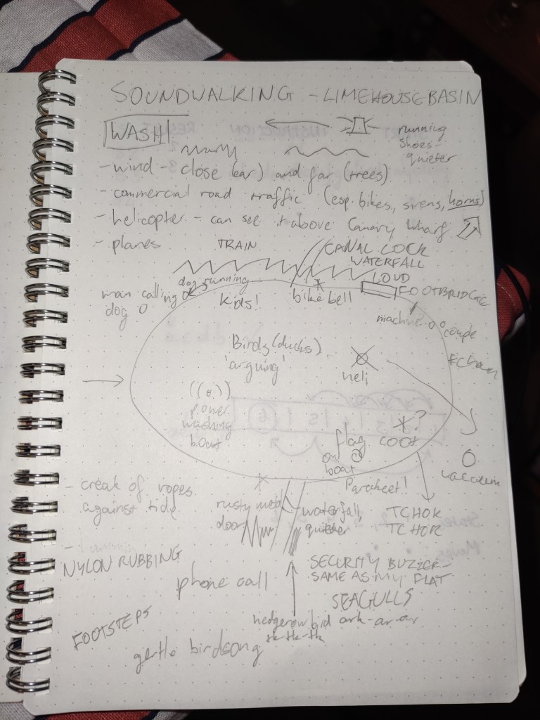 We began our work on the brief by getting into our environments to do a soundwalk as soon as possible. I took mine around Limehouse Basin, near where I live: a marina a good distance from main roads but subject to a great deal of background noise from Commercial Road and London City Airport, as well as the DLR.