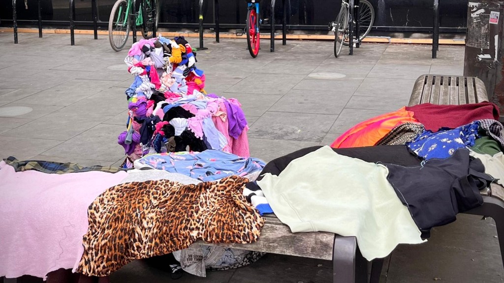 When we first arranged our example fabric in a public space, some of the group felt it looked underwhelming, and decided to move towards personalising furniture rather than the space. I disagreed with this, as it felt as though it was moving away from our research on hostile architecture and softening the space, but considering the amount of time remaining it was important to commit to what we felt we were able to finish.