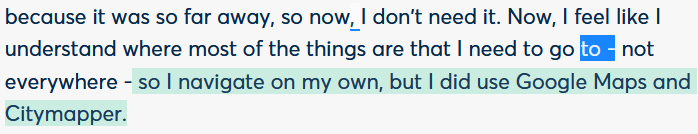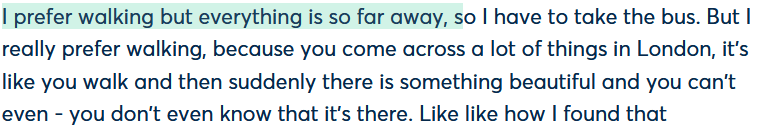 Additionally, we asked around the apps and tools that participants used to navigate. Google Maps, Apple Maps and Citymapper were all mentioned, particularly for public transport, but almost every participant mentioned a desire to explore on foot and “stumble across” interesting things