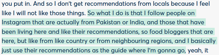 One interesting insight is how these people gained recommendations on what to do. We had assumed that maps software would be a common suggestion, but people placed a lot more emphasis on word of mouth and social media than anything else, in order to avoid busy or “touristy” locations.