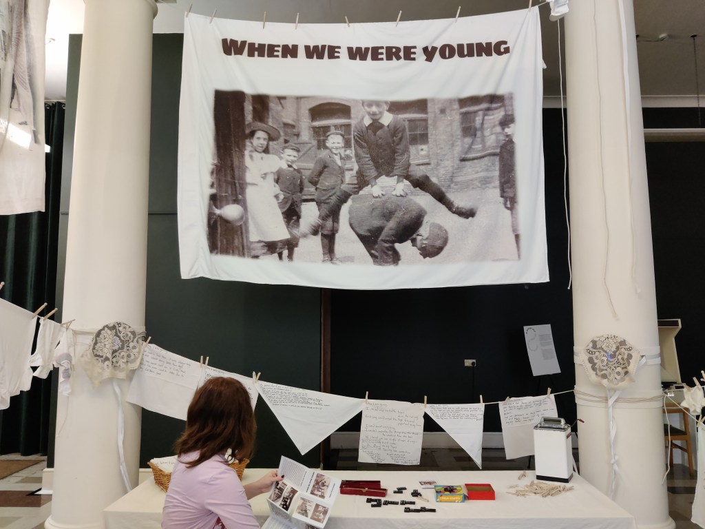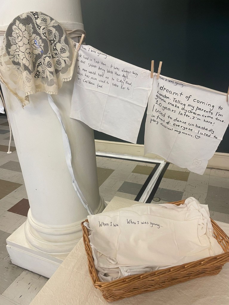 As pieces of sound art, each exhibit represented ways in which we could incorporate local histories into physical space. One example was Emily Peasgood’s When We Were Young, focusing on childhood stories, in which child actors re-recorded archival footage over sounds of children playing, and participants were invited to hang stories on a line like laundry. Another, by Alastair Levy, features stories playing over film photos of protests in Cable Street and Brick Lane.