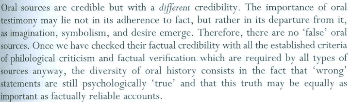 We identified this week that gathering content for the project will be a real challenge. If we want to populate real places, we will need real stories from real people. To this end, we’ve been studying the theory around oral history, particularly the work of Alessandro Portelli and how he claims preserving the subjective ‘truth’ in oral history is incredibly important.