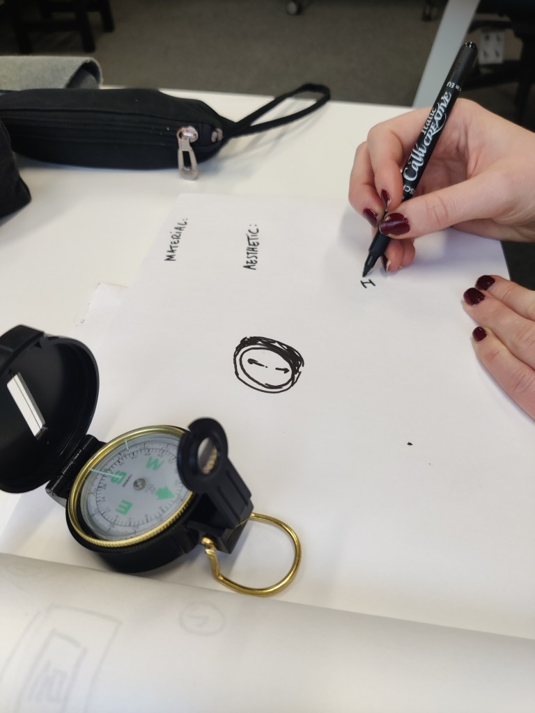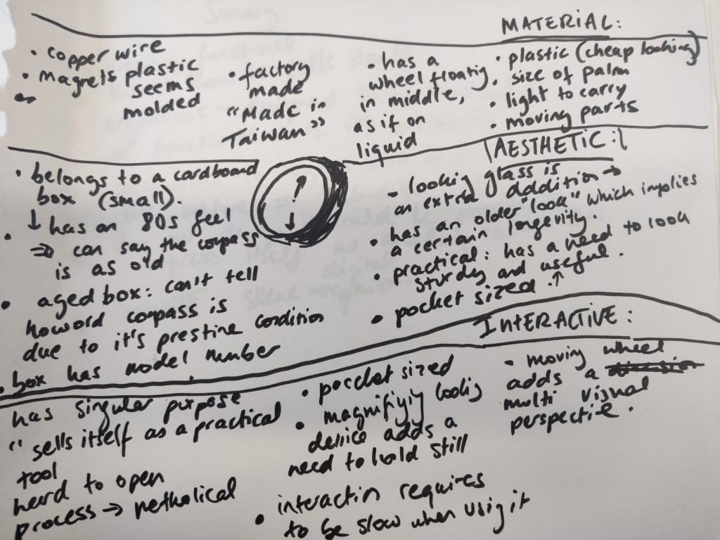 Now that we are fixed on the form of a compass for our physical outcome, it is important to understand the full aesthetic implications of the form, and so an artefact analysis is important. We used a small pocket compass that we had ordered from eBay as our source here.